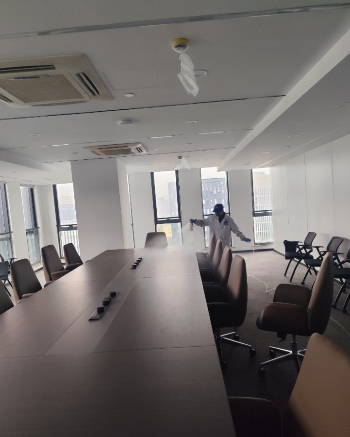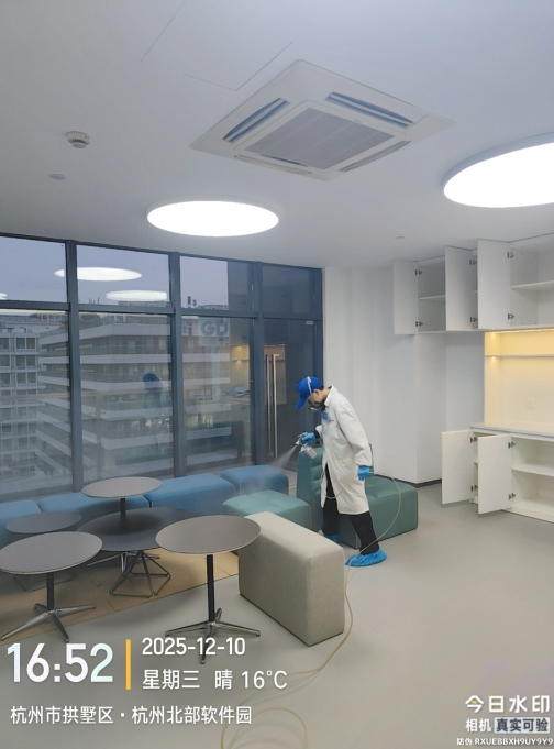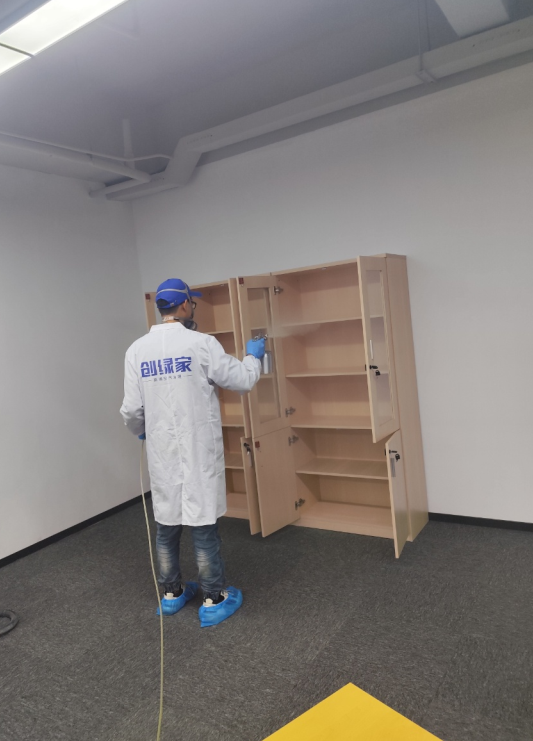 2. 分區域靶向治理:針對不同區域的污染源特性,精準施策、差異化施工;重度污染區人造板辦公桌、文件柜,采用高壓霧化噴涂靶向分解劑,深度滲透板材內部分解甲醛;后續噴涂植物萃取除味劑,同步去除家具異味,隱蔽部位逐一細致噴涂,不留死角。