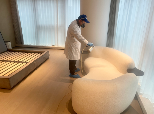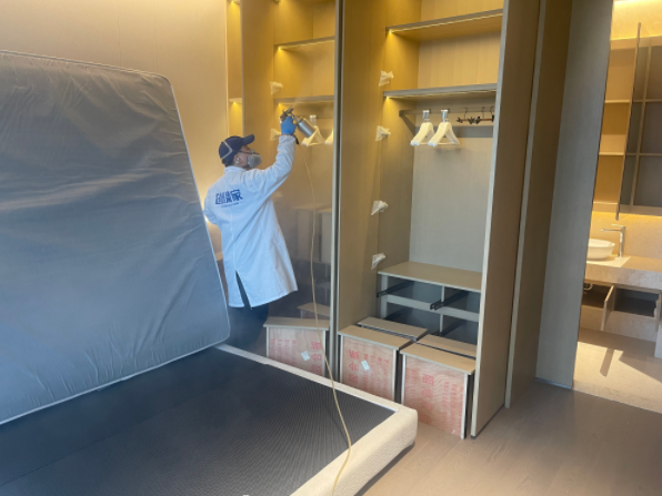 世紀(jì)國泰中心坐落于錢江世紀(jì)城核心板塊,毗鄰杭州國際博覽中心、奧體中心等城市地標(biāo),其大平層產(chǎn)品以大尺度空間、高端精裝配置成為城市高凈值人群的人居之選。本次治理的 500㎡大平層涵蓋多間臥室、超大面積客廳、獨立功能區(qū)等空間,全屋采用高端實木定制柜、進口軟裝面料、藝術(shù)墻面涂料等裝修材質(zhì),雖提升了居住品質(zhì),卻因板材膠黏劑、軟裝印染劑等形成了隱蔽且多元的甲醛污染源;加之大平層空間開闊、部分區(qū)域通風(fēng)條件有差異,普通除醛方式難以實現(xiàn)全空間、深層次的凈化效果。業(yè)主在參考杭州除甲醛公司品牌排名后,認準(zhǔn)創(chuàng)綠家的品牌實力與高端項目治理經(jīng)驗,最終選定創(chuàng)綠家為本次大平層的專屬除醛服務(wù)商。
